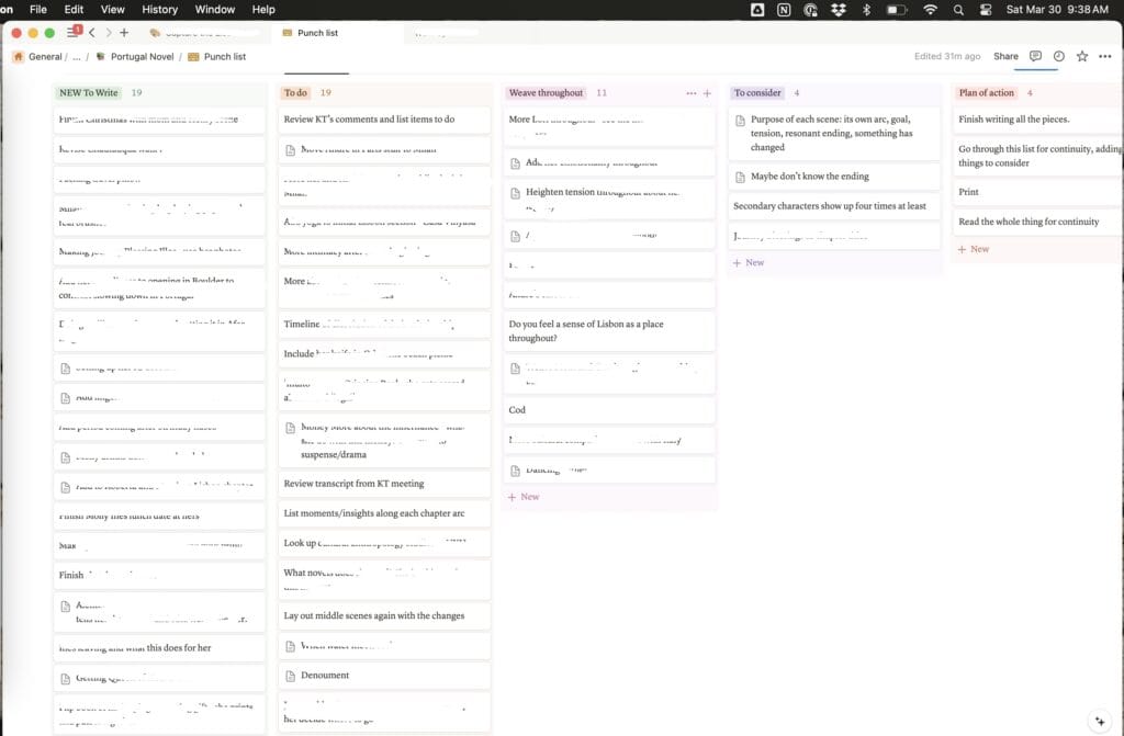 Here’s a punch list I made in Notion for my novel-in-progress. I have whited out the details to avoid spoilers.