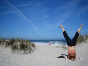 Morning beach yoga, Portugal 2008
